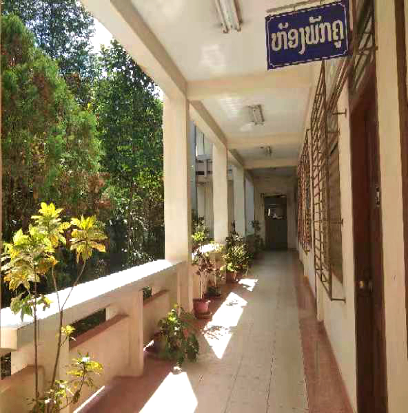 這是我上課的教學(xué)樓——語(yǔ)言學(xué)院,遵循著“看人先看臉”的原則,我們先看一下它的外在環(huán)境。看過前幾期介紹的小伙伴不難發(fā)現(xiàn),老撾國(guó)立大學(xué)的教學(xué)樓基本都是紅頂白墻,活潑跳躍的顏色彰顯著這所學(xué)校的朝氣。