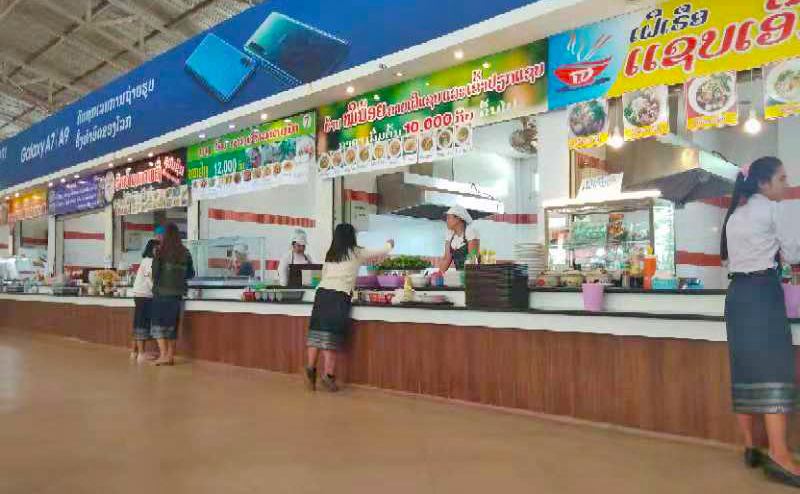 不同的食物由不同的窗口售賣,當(dāng)然打飯的窗口跟中國(guó)“玻璃窗后的阿姨似乎總有點(diǎn)手抖”不同,老撾國(guó)立大學(xué)的食堂窗口更像展會(huì)現(xiàn)場(chǎng)的攤位,制服統(tǒng)一的阿姨笑容滿面地等待你的到來(lái)。