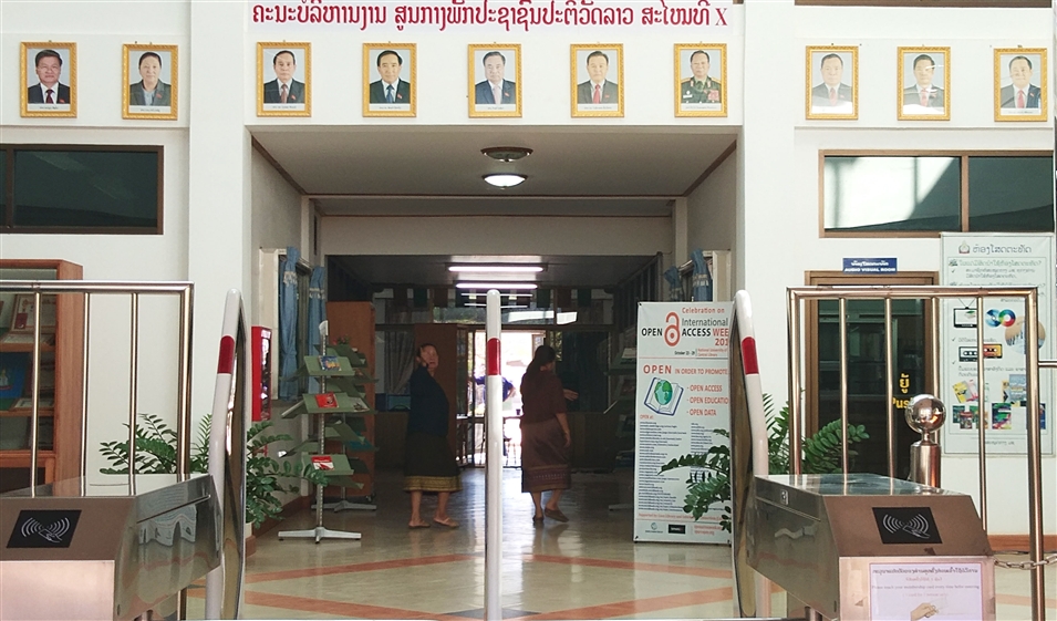 正對(duì)著圖書(shū)館入口處的墻上掛著一排相框,展示的是本屆老撾人民民主共和國(guó)中央領(lǐng)導(dǎo)的照片。