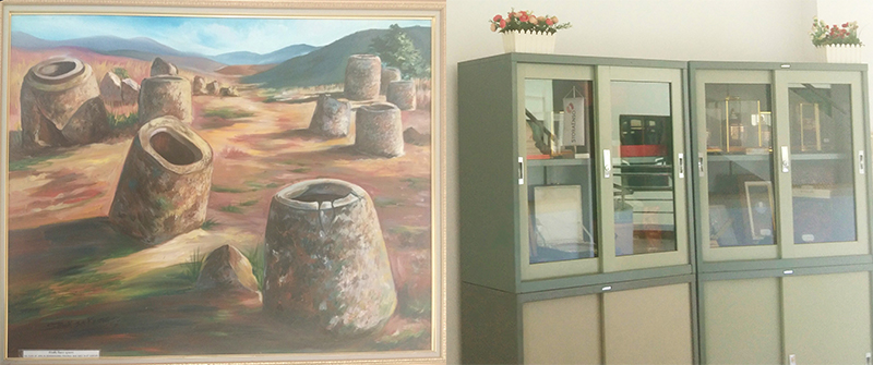 二樓樓梯拐角處掛著老撾古老寺廟油畫(huà),旁邊的柜子里整齊擺放著幾排各國(guó)國(guó)旗;三樓樓梯拐角處掛的則是川壙省石缸平原油畫(huà),旁邊的柜子里放置著一些老撾紀(jì)念品。