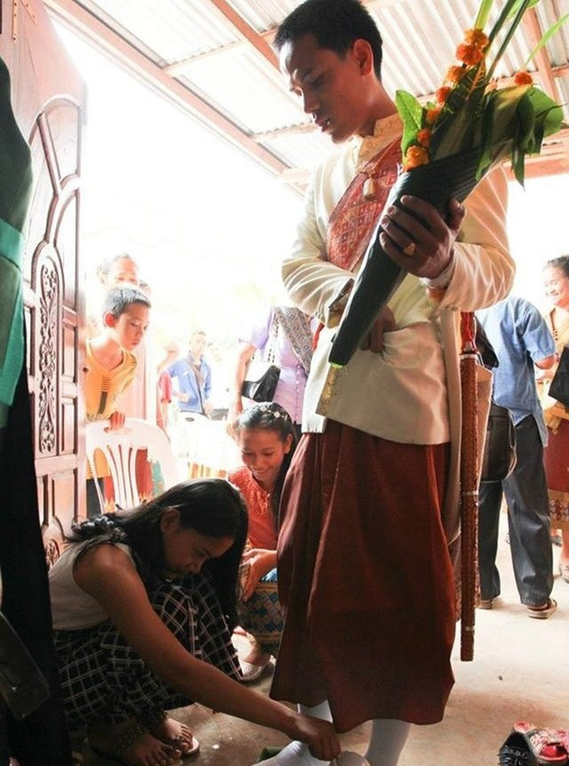 老撾婚禮中有一個(gè)很重要的儀式,老撾語稱“女婿游行”。即婚禮當(dāng)天,新郎按傳統(tǒng)風(fēng)格打扮,穿兜襠褲,配寶劍,手拿甘蔗和鮮花(象征保衛(wèi)愛情和創(chuàng)造甜蜜美好的新生活)前往新娘家。在距離新娘家還有一段距離時(shí),所有人必須下車,步行向新娘家走去。為體現(xiàn)男方家的誠(chéng)意和身份,迎親隊(duì)伍會(huì)制造隆重?zé)崃业膱?chǎng)面和氣氛,一路敲鑼打鼓,鳴放鞭炮,載歌載舞。