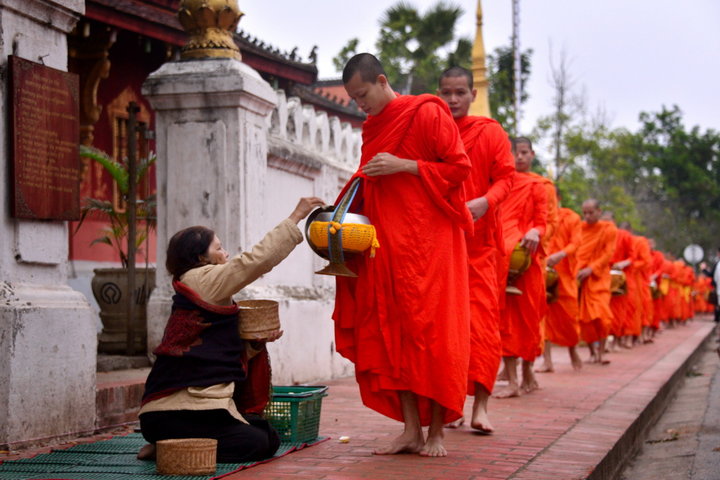 瑯勃拉邦的寺院是不開伙的,僧人每天清晨赤腳走向大街小巷尋求布施,信徒們鋪張席子,跪在路旁,每天將清晨親手做的第一鍋米飯贈與僧侶,成為瑯勃拉邦一道獨特的風景線。