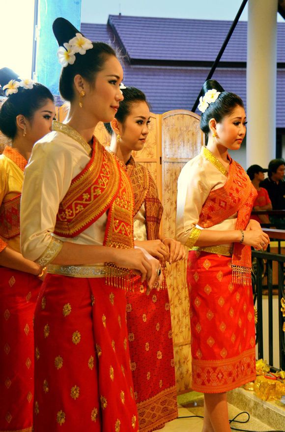 老撾女士一般都有多套正裝行頭,面料看起來明顯出自于手工紡織。女士的正裝色彩斑斕,配上做工考究的民俗圖案和珠璉佩飾,給人一種質(zhì)樸、莊重的感覺。年輕女士的正裝顏色豐富,以鵝黃、桔橙、粉色、淡紫為主要色彩;中老年女士的正裝則青睞深紫、咖啡、墨綠、深藍(lán)等顏色。老撾人在集會時,一定會正裝出席,一改平日休閑、隨意的裝束。