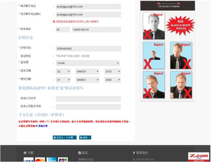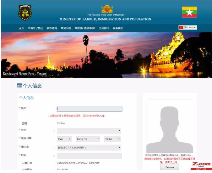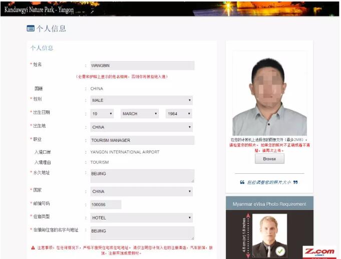 這是頁面的上半部分;比較簡單;名字;國籍;性別,出生日期;出生地,職業(yè),這些都按照護照的信息填寫;常駐家庭地址;國家;郵編;在緬甸的入住酒店的類型;酒店,公寓,快捷酒店;之類的選擇;酒店的名稱;還沒有預定的話,就可以上網(wǎng)預定一個可以取消的那種;很多網(wǎng)站都可以在一定時間內(nèi)取消酒店;預定一個,這些酒店信息就都有了;注意,照片不能大于2M哦;