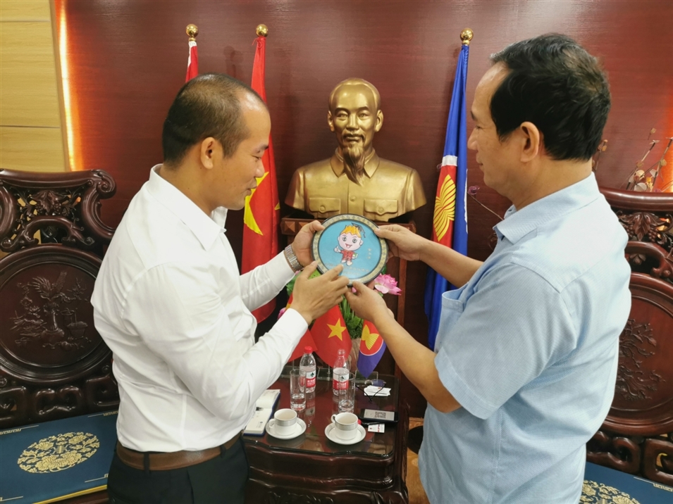 (廣西金沛教育執(zhí)行董事粟宥朝先生向越南駐南寧總領(lǐng)事黃玉榮先生贈(zèng)送金小沛紀(jì)念品)
