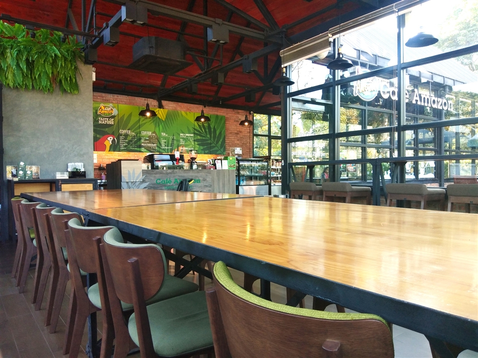 亞馬遜咖啡館的紅磚外墻與干凈明亮的落地窗相映,充滿休閑氣息。室內(nèi)寬敞整潔,歸本主義的原木桌椅,適合打發(fā)午后的閑暇時光。