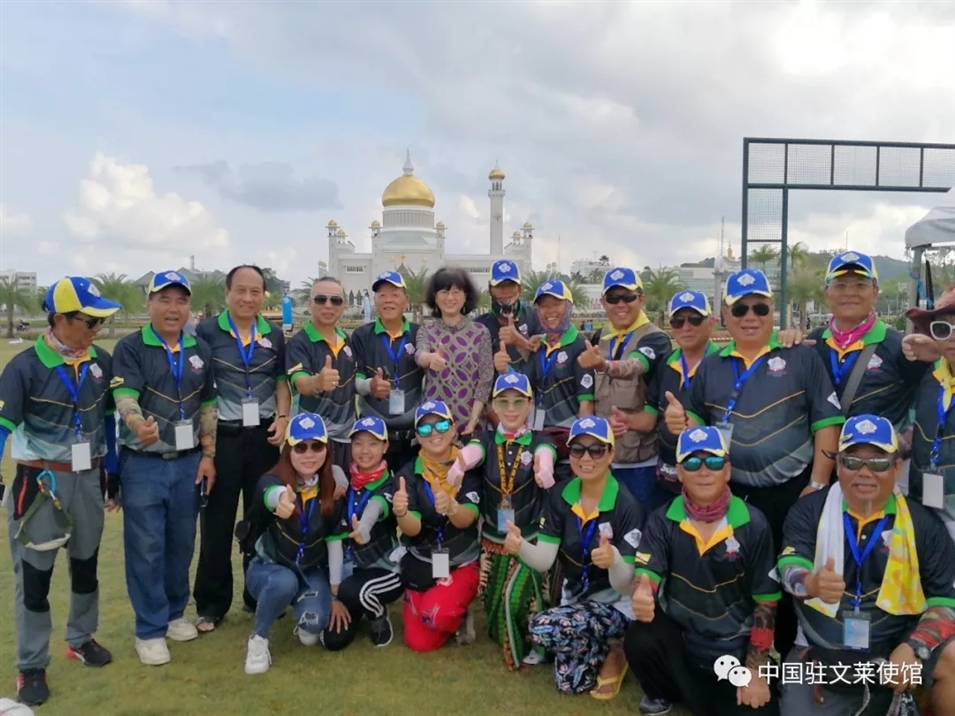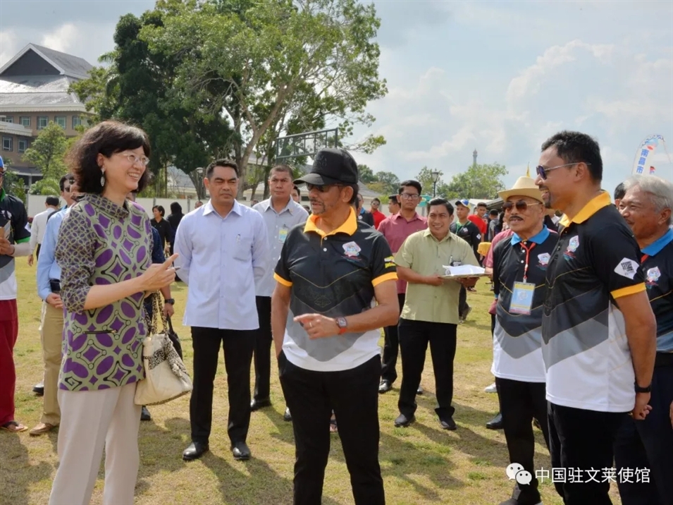 317日,于紅大使應(yīng)邀出席文萊首屆國際風(fēng)箏節(jié)開幕式。于紅大使在開幕式前看望中國選手,為他們加油鼓勁。于紅大使還陪同文萊蘇丹、王儲等王室成員和中國選手交流。