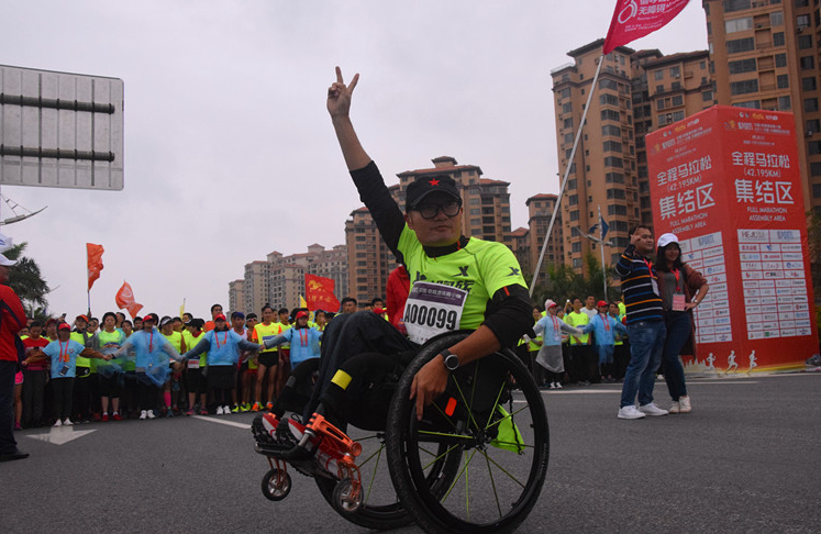 在眾多的選手中,坐在輪椅上的張先生顯得尤為搶眼。張先生來自廣州,他告訴記者,這是他參加的第54場(chǎng)馬拉松比賽,也是第一次參加全海景跑道的馬拉松, “我參加比賽不是為了出成績(jī)或出風(fēng)頭,而是重在參與,是想體現(xiàn)一種精神?!睆埾壬f,他不一定能全部“跑”完全程,但他一定會(huì)堅(jiān)持到最后。