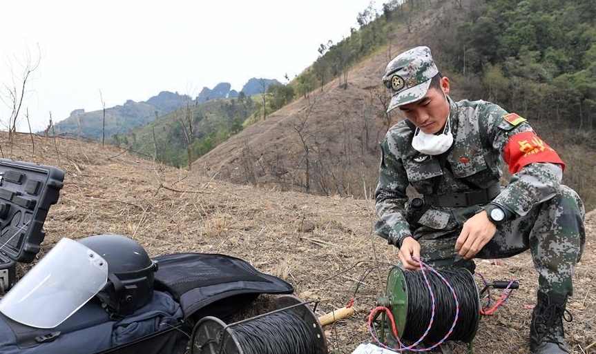 一名掃雷戰(zhàn)士在中越邊境廣西段某雷場(chǎng)檢查爆破線路